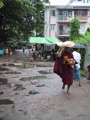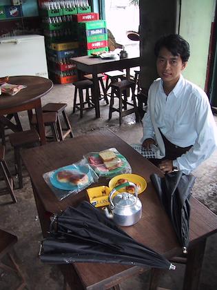 | Tutu in a teahouse. Notice the plates with snacks on them in plastic bags. These are so the flies don't settle on them. The snacks stay out until somebody eats them. | | A monk going begging. They wear their robes a special way when they beg, rolled up around the neck. Also, when they beg they don't use umbrellas, only their fan. |