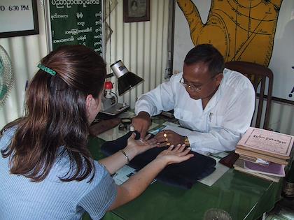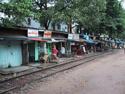 | Astrologer row in Yangon, with rows of palm readers and astrologers. | | The train runs right along the astrologer's shops. |