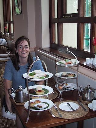 | Schoolchildren in the standard green/white costume. | | Here I'm having a very civilized "high tea" at the Strand, a fancy renovated old hotel. Rooms are $400 a night, but only 2 out of 32 are occupied. |