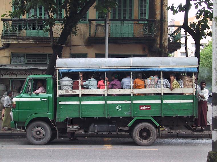 This is a typical bus in Yangon, except it's usually a lot more crowded. Often men are hanging 2 or 3 deep off the back.