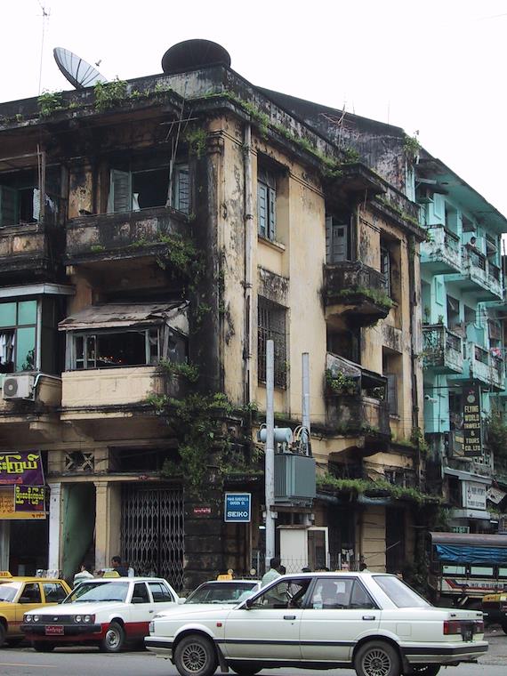 There's so much rain in Yangon! Some buildings were covered with moss and weeds growing out of cracks in the buildings.