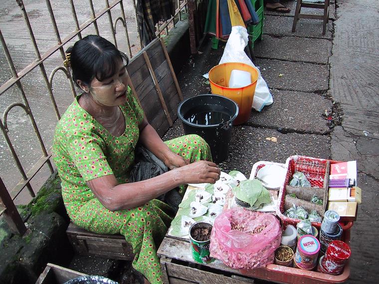 This woman is selling betel nut, which is chewed for a slight high. It's sold wrapped in a leaf, with a coating of lime. It makes your teeth really red, and the sidewalks are full of brick-red stains where people have spit the juice. Notice also the woman has yellow thanaka paste on her face.