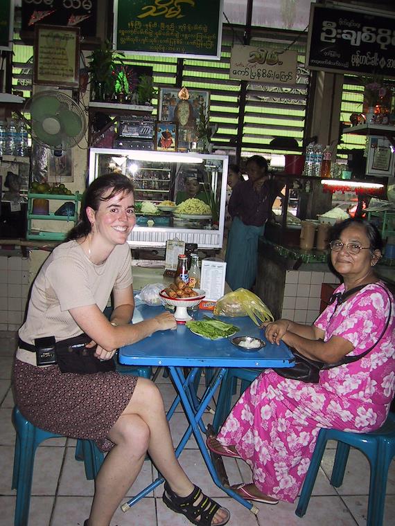I met Angela when trying to figure out what the white paste packaged with the betel nuts was. (It's lime). She learned English in a convent school as a little girl, and speaks it very well. This is Angela and me, having lunch at a restaurant in Bogyoke market.