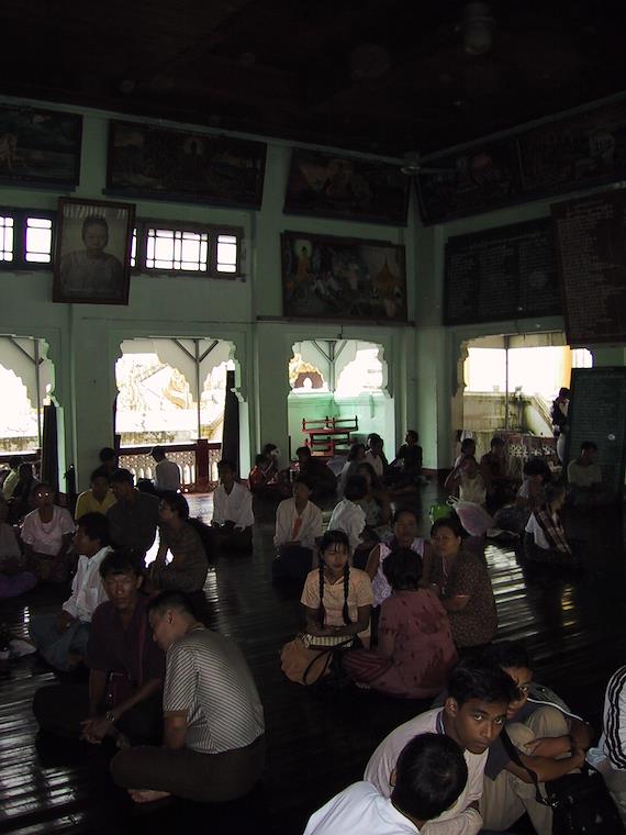 People resting in Shwedagon. Notice the pictures close to the ceiling. They represent episodes in the life of Buddha.