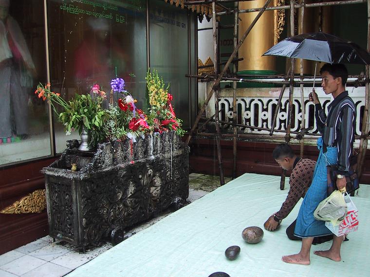 This is at Shwedagon Pagoda, a Buddhist temple, but it's actually a nat, or spirit shrine. People pray for specific things here, and then lift a rock. If the rock feels light to them, their wish has been granted.