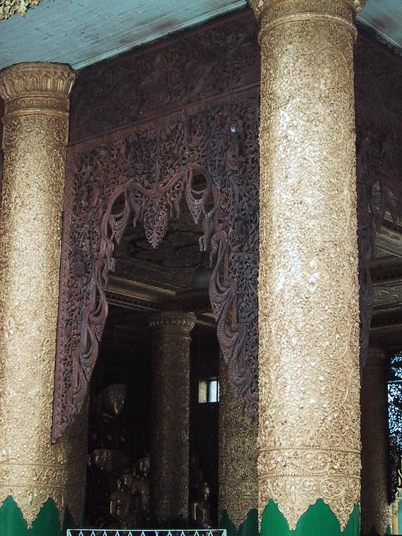 Intricate wood carving at Swedagon Pagoda.