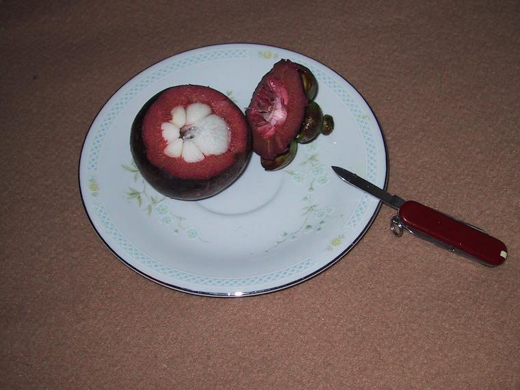 I bought some mangosteens on the street. They're my absolute favorite fruit here. The taste is hard to describe, but oh-so-good!
