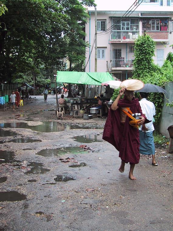 A monk going begging. They wear their robes a special way when they beg, rolled up around the neck. Also, when they beg they don't use umbrellas, only their fan.