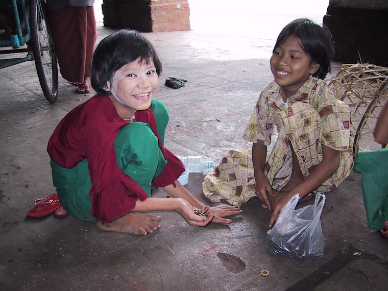 Little girls playing a guessing game with custard-apple seeds on the street. They grab a handful, and try to guess whether the number of seeds is odd or even.