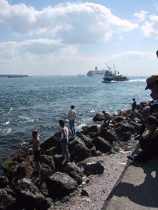 | Our hotel in Istanbul, Hotel Sebnem, had some great handmade embroidery in the rooms. | | On our first day, we took a walk along the Bosphoros, very close to Old Istanbul, where we stayed. It was packed with fisherman, trying their luck. |