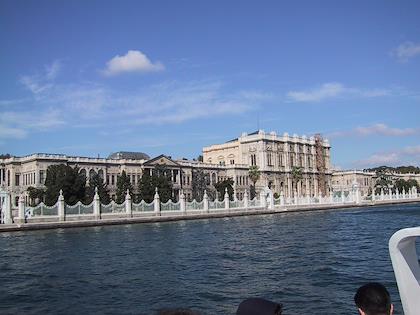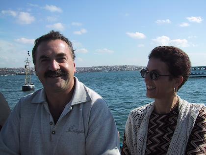 | We took a ferry along the Bosphoros. After we saw this palace along the water... | | ...we asked this man, who looked very Turkish to us, in Turkish, what the building was called (using our phrase book). He stared at us blankly for a few seconds, then said "I don't speak Turkish", in Australian English! We all had a good laugh over that. The name of the place was the Dolmabahce Palace. |
