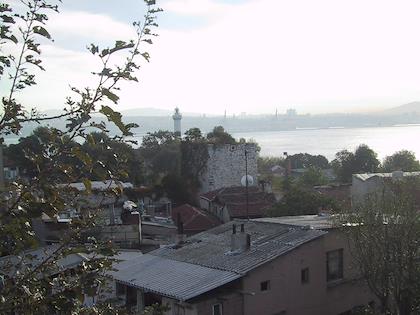 | This is the view from the outside patio on which we had breakfast at our hotel. | | Just outside the Topkapi palace, which was the living quarters of the sultans from the 1400 until the early 1800. Many of the tourist facilities are heavily guarded, because the Turks want to protect the tourism industry from potential terrorist attacks. This guy was a lot friendlier than he looks. |