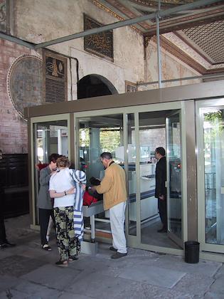 |  | |  | | The matched marble panels are original, from around 500 BC, ordered by the emperor Justinian. | | There's a little hole in this column, just big enough for your thumb. Legend has it that if you put your finger in the hole and make a wish, it will be granted if it comes out moist.. |
