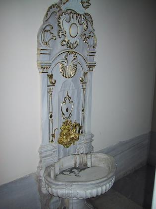| We took a tour of the harem inside Topkapi palace. Some of the most interesting things to see there were the old-fashioned and ornate plumbing facilities, used by the sultan. | | This is a Turkish style squat toilet, with facilities for hand washing. Only the best marble for the sultan, of course. |