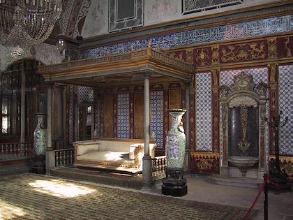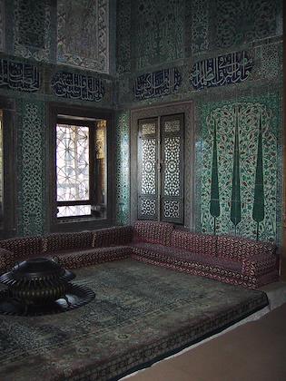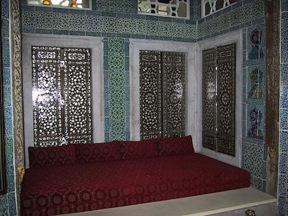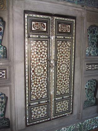 | This is the Emperors Chambers. | | Many cabinets looked like this, with mother-of-perl inlaid with tortoiseshell. According to our guide, often the sultans made these cabinets as a hobby. |