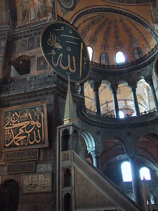 |  | |  | | Right outside the Aya Sofia are the ruins of another church, from around the year 400. Excavations appear to be ongoing, and debris is scattered about outside. | | This is the inside of the church/mosque/museum. Notice the huge Islamic placards hung up to make it less church-like. The placards show the names, in Arabic, of God, Mohamed and the 4 caliphs. |
