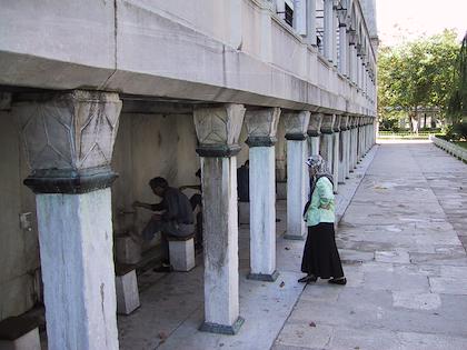 |  | |  | | Outside the Aya Sofia were faucets where faithful Moslems are supposed to wash their hands and feet before prayer. | | I'm sure these were flat slabs of marble to begin with, but after thousands of people sitting on them, there's a definite butt-shaped imprint in them. |