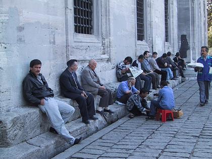 |  | |  | | This man was selling pirated software, close to the covered market. There was a cop right next to him, chatting with the vendor, but he walked away when we took out the camera. Notice the guy looking at us anxiously. He appealed to the cop, to try to stop us from taking the picture, but the cop just laughed. He put away his pirated software right after we took this picture. | | This is a typical scene in Turkey--lots of men, just hanging out. I wonder if they're unemployed. |