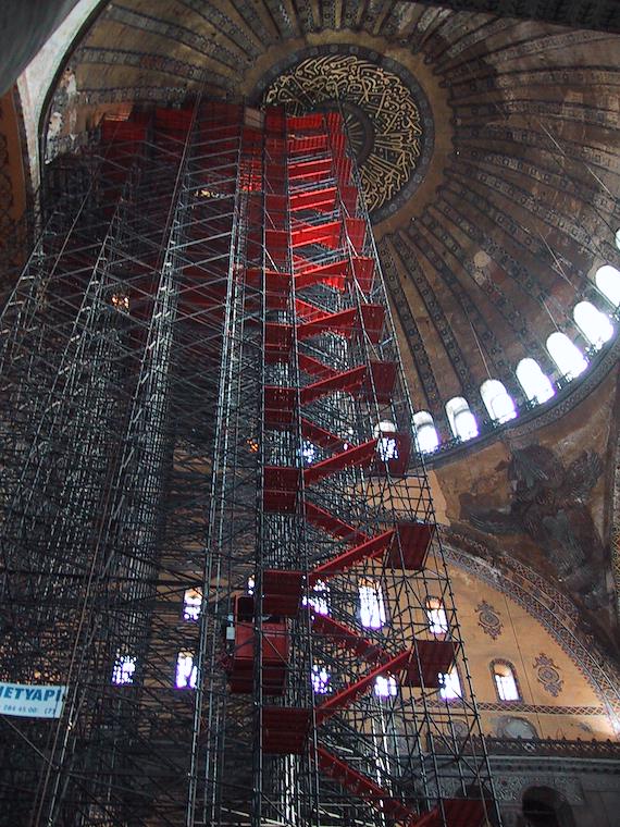 There's a massive reconstruction effort underway, with some very impressive scaffolding. Notice the elevator going up (the red box near the bottom).