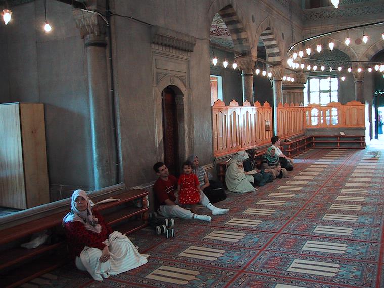 Some people use the mosques as a place to rest. The shelves on the side are for storing shoes.