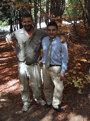 | Zeki drove us up Uludag, a mountain that rises up behind Bursa. Along the road was a farmer selling his products--quinces, apples, and walnuts. He presented us with a large bag filled with everything he sold, as a present. It was the first time we'd tasted quinces--they're tasty, similar to apples, but very hard and a little more acidic. | | Zeki and Eric on Uldag. |