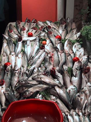 | Eric testing the waters at the Huzur Hotel, which is where we ended up staying. The Bursa area is very famous for its hot springs, and the nicer hotels usually have a facility for "taking the waters". We ended up not using it, though--too hot and claustrophobic. | | Zeki took us to a fish restaurant that evening. If you look at the larger version of the picture, you can see that the fish have their gills pulled over their mouths, to show how red the gills are (and thus how fresh the fish is). |