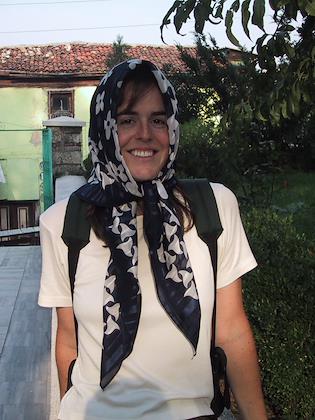 | At the Yesil Camii, this young man came up to talk to us. Nuri Yildiz was his name--he's a 5th year English student at the university, and he comes and talks with tourists at the mosque to practice his English. Eric has a container of Aryan in his hand--it's a drink made of yogurt, water, and salt, that's sold everywhere. | | We bought a scarf so that I could go into mosques. This is me in front of the Yesil Camii. Cute! |