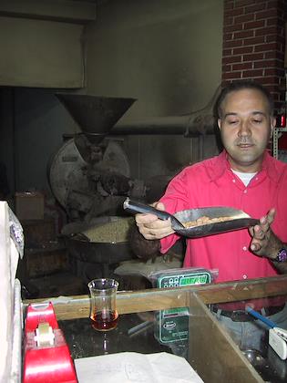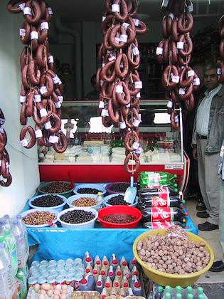 | Next door was a sausage and olive shop. There's a tremendous variety of olives here! | | Also in the bazaar was a shop which sold roasted nuts and seeds. We had some excellent pumpkin seeds here, and also pistachios. The owner really knew his stuff, and gave us some Turkish Delight, a soft jelly-like candy, for free. |