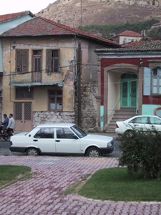 | This is our first few minutes in our new rental car, a Renaut Sahin. Eric misses the big V8 engine in his car at home! | | This is the car in Bergama, the site of the ancient Greco-Roman city of Pergamum. Pergamum is at the top of the hill in the background. |