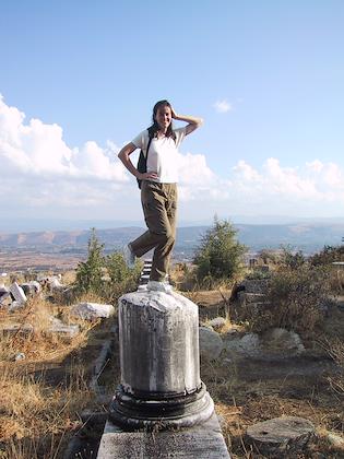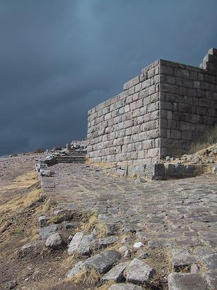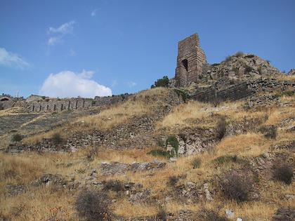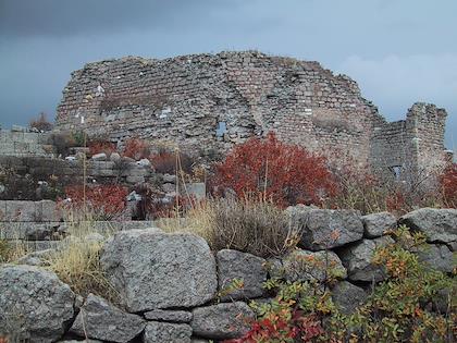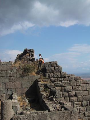 | Right next to the basilica was an olive tree. Later we saw thousands of them, but this is my first close up of an olive tree in Turkey. | | This is the hilltop acropolis of Pergamum. Parts of it are very well preserved, like this city wall. It was really exciting to climb on walls that have stood there for millennium. Great views of the area, too. Notice the clouds looming above. |