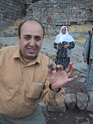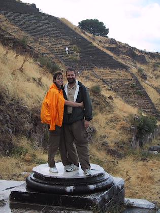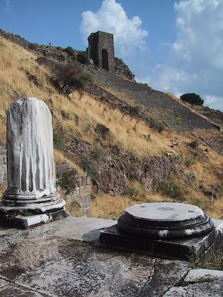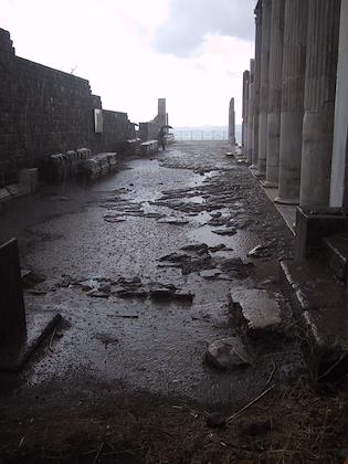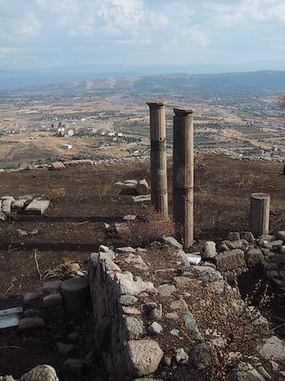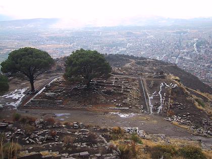 | It started raining, and how! We huddled among the ruins for a while, and escaped the worst of it. | | This is a great view of the Temple of Zeus, and Bergama in the background. Most of this building was moved to a museum in Berlin in the 1800s. |