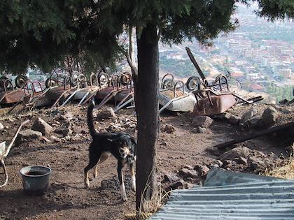 | The road to the middle city. | | There's still some excavation going on in the middle city. This must have been a guard dog. Luckily he was tied up. See how friendly he is! -- NOT! |