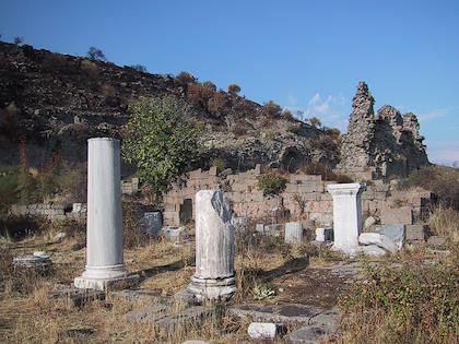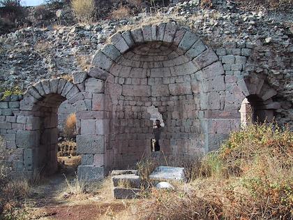 | We didn't know what this was at the time we saw it. After seeing many more ruined cities, it was obvious to us--it's a bath! People walk into the water on the steps. | | The middle city, with Bergama in the background. |