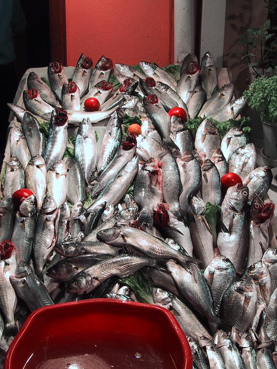 Zeki took us to a fish restaurant that evening. If you look at the larger version of the picture, you can see that the fish have their gills pulled over their mouths, to show how red the gills are (and thus how fresh the fish is).
