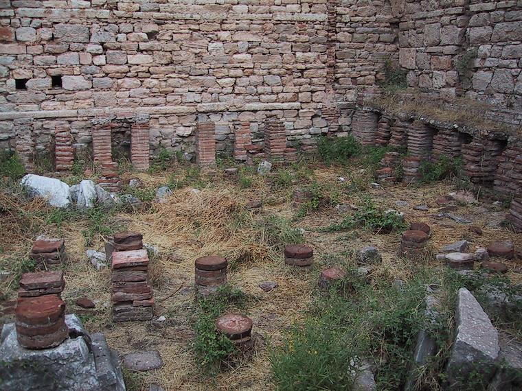We had a hard time figuring this one out, then asked somebody with a detailed guidebook. Turns out that this was something like the steam room in a bath. Hot water circulated between the stacks of bricks, upon which a marble floor was supported.