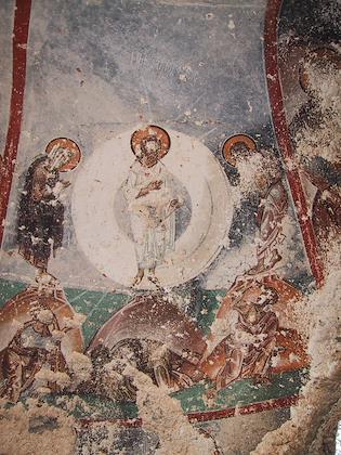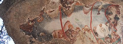 | The ruins of the monastery extended over a couple acres. | | This fresco, painted under a rock, would have been impossible to find had we not met an older German couple coming down when we were going up who gave us directions. The overhang of the rock was plastered, and the fresco was applied to the plaster. |