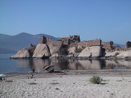 | Donkeys were everywhere in this village. Maybe this was the one that brayed loudly all throughout the night, and kept us up! | | Just outside the village, there were the ruins of a Byzantine castle on an island in the lake. |