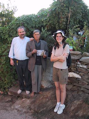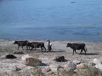 | The man with the photo had wanted to be our guide up to the monastery, but we had no problem finding it ourselves. The photo he's holding in his hand shows him, pointing out some prehistoric painting that we'd missed along the way. | | Back in Kapikiri, it was time for the cows to go home. |