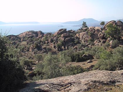 | Fences were always homemade affairs, made of brush, branches, and twisted wires.. | | A view of Lake Bafa from the trail. |