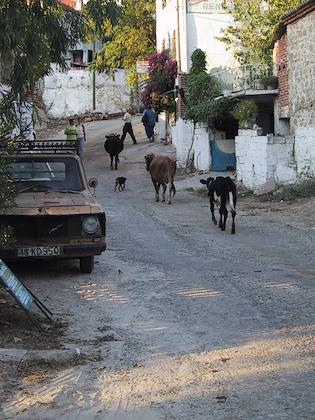 | The mountain that towers over Kapikiri is Besparmak Mt., or Five Fingered Mountain. Notice the solar water heater on the house. They're very common here--I think most water heating in costal Turkey is solar. | | Village life in Turkey. Take a good look at the rocks that make up the stone wall--many of them are from torn-down ruins. |