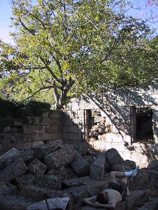 | The caretaker is drying walnuts on top of his roof. | | Eric is taking a rest inside the Temple of Zeus. |