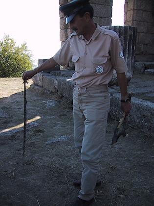 | Leading cows to pasture. | | This is the the base of the Temple of Athena. The rooms at the bottom are now used as enclosures for cows. |