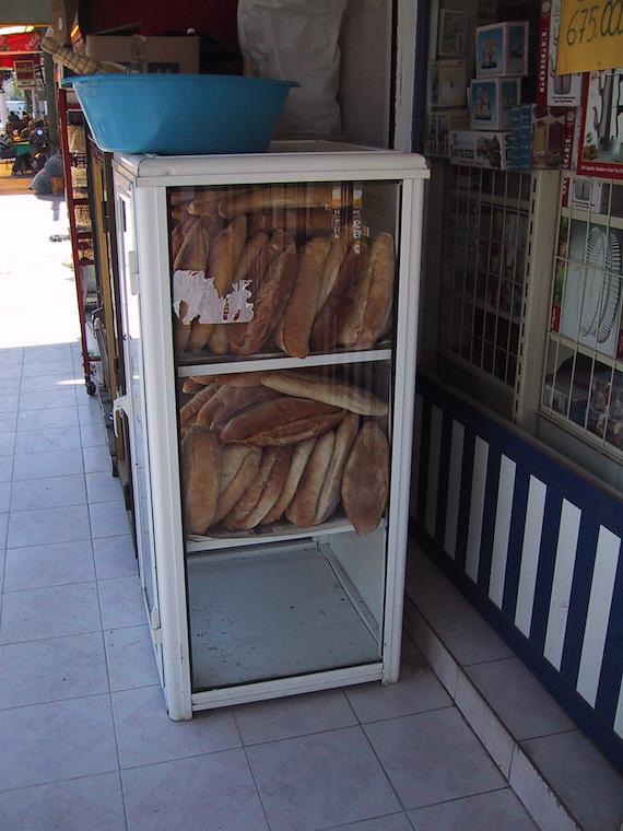 We went grocery shopping in Milas. Bread is always sold like this, in glass cases outside the stores.