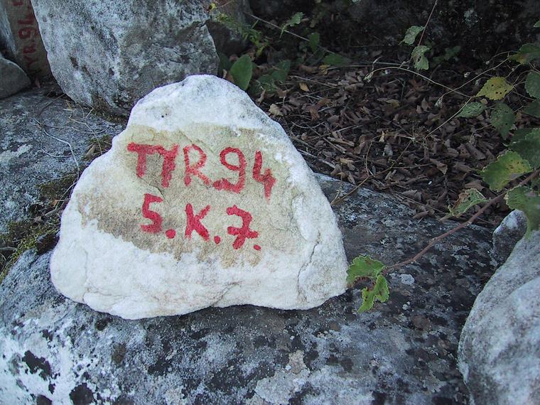 Many rocks in the ruins were painted by archeologists with marking indicating where they were thought to come from. This one is from the ruined theater.