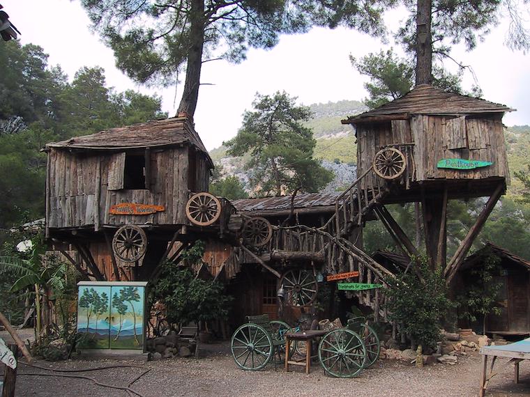 One of our planned stops along the way to Kemer was Olimpos, a very fine and scenic set of ruins. This is an unplanned stop--it's a treehouse hotel/hostel, catering to young travelers planning on staying there for a while. There were some very funky buildings.