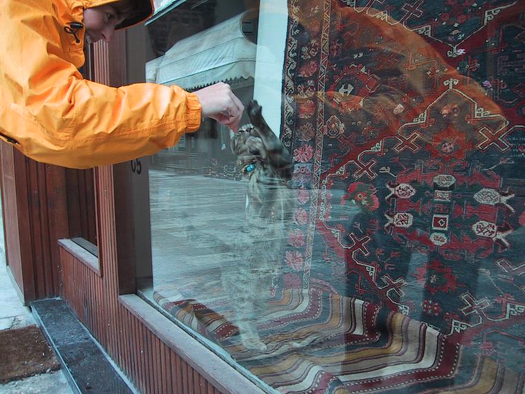 The carpet shops put little kittens in the window to attract tourists to the window. Then the store owners will chat with them, and invite them inside to drink some tea and look at carpets.