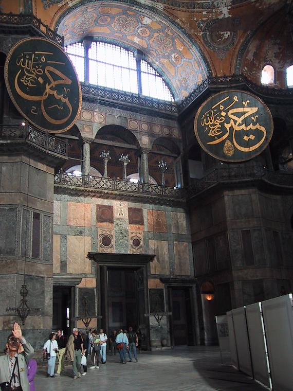 This is the inside of the Aya Sofia in Istanbul, which was first a church, then a mosque, and now a museum. Notice the huge Islamic placards hung up to make it less church-like. The placards display the names, in Arabic, of God, Mohamed and the 4 caliphs.