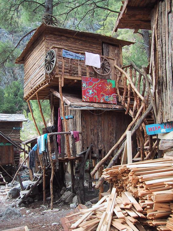 One of our planned stops along the way to Kemer was Olimpos, a very fine and scenic set of ruins. This is an unplanned stop--it's a treehouse hotel/hostel, catering to young travelers planning on staying there for a while. There were some very funky buildings.