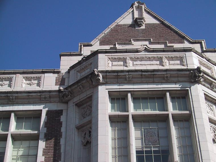This is (was) the home-economics building. There are statues of women all over the corners doing varieties of tasks. There is a single status of a man. Can you guess what he is doing? Let me tell you that this was built at the turn of the century! Answer: he's directing the woman with a list of tasks!