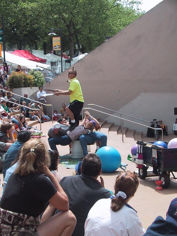 Another performer, juggling long knives surrounded by men supported by eachother's laps.